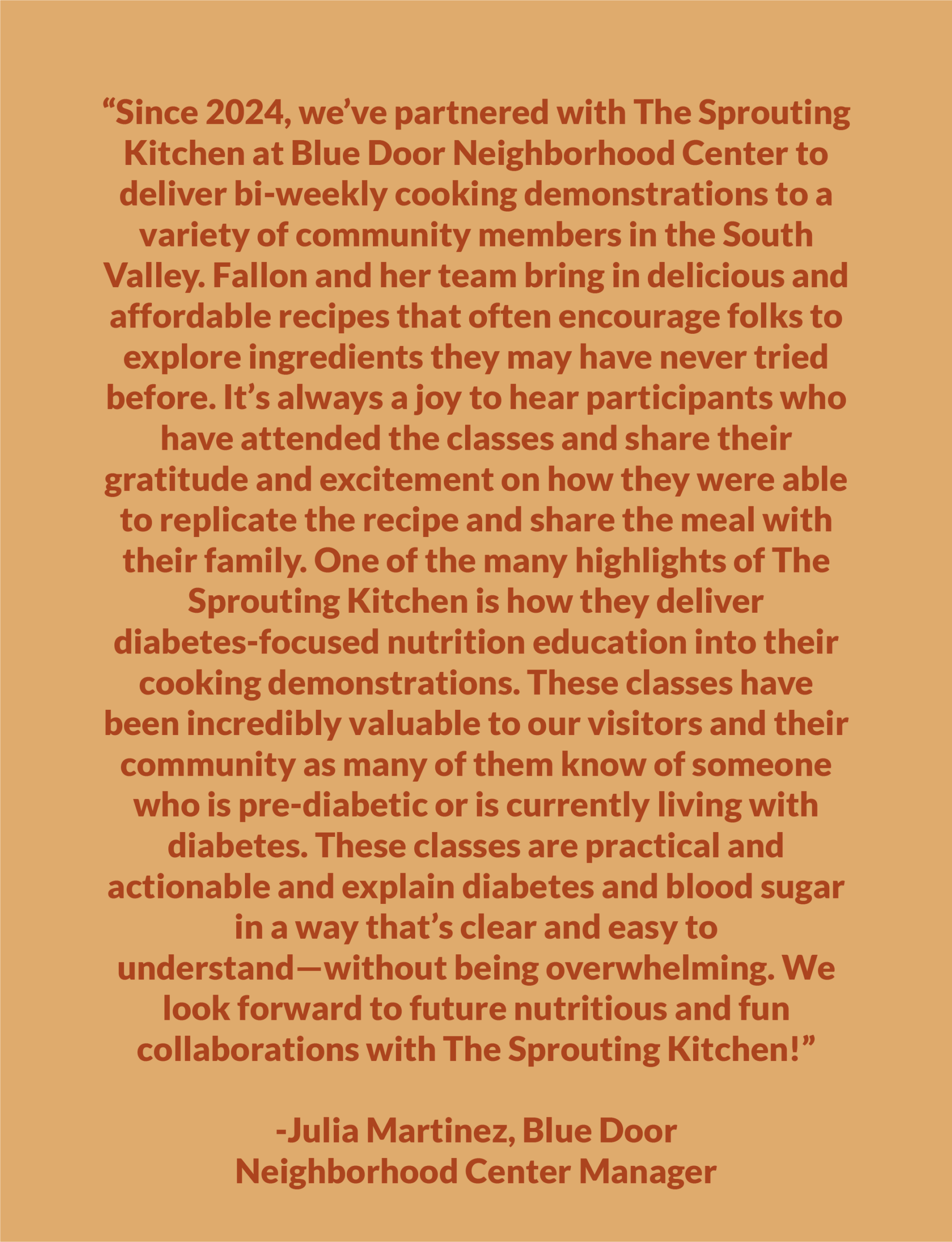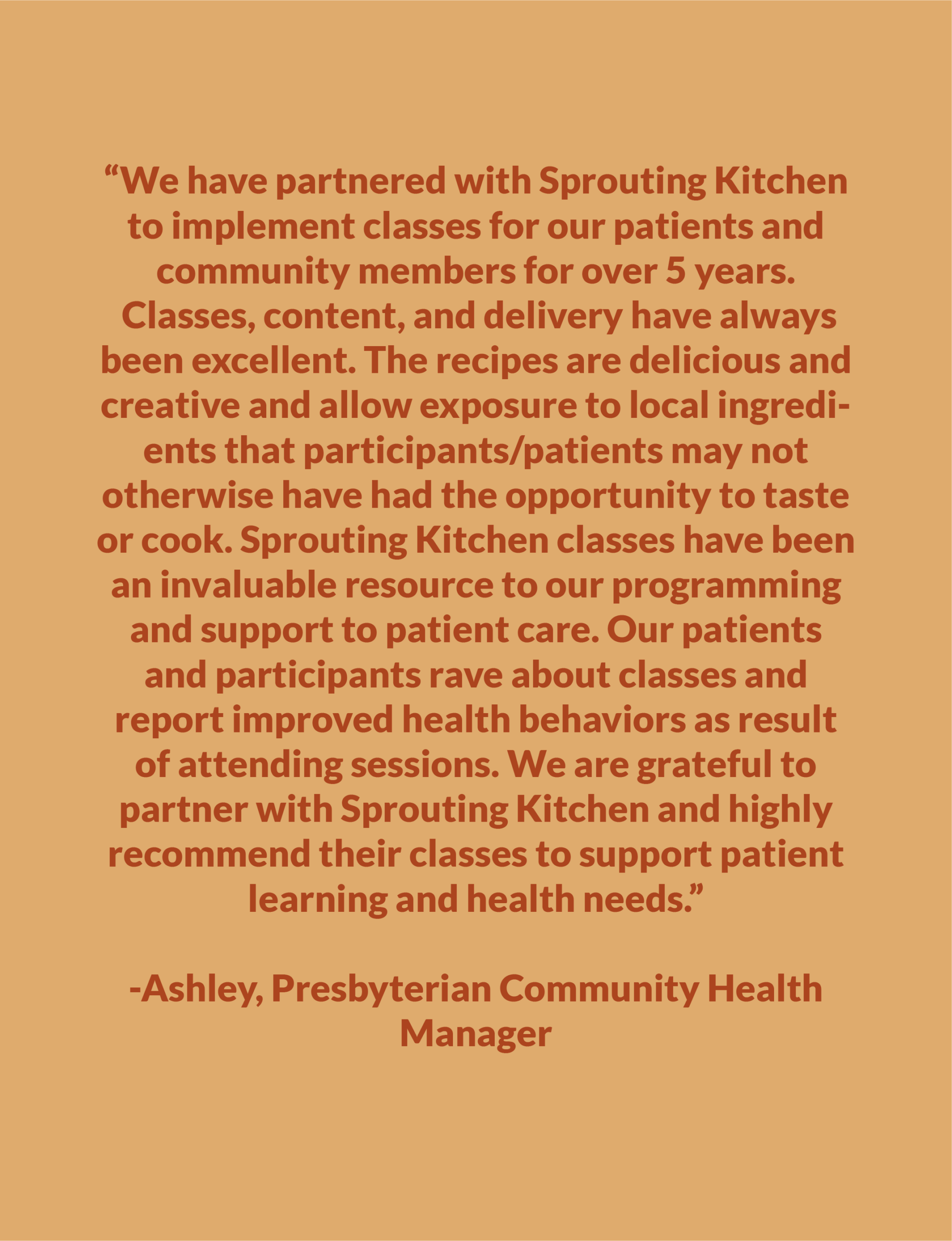 education programs, virtual cooking classes for organizations, community health cooking workshops, and more.